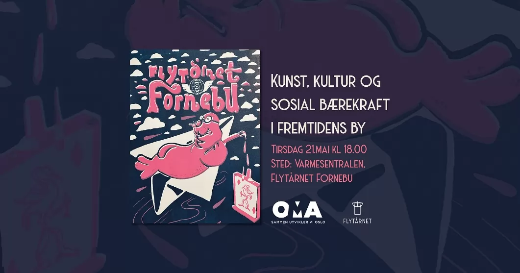 Åpent møte på Flytårnet Fornebu- Varmesentralen, tirsdag 21. mai kl 18 Flytårnet Fornebu inviterer i samarbeid med Oslo Metropolitan Area (OMA) til debatt om kunst og kultur sin plass i byutviklingen- hvordan sikre kultur, kunstopplevelser og sosiale møteplasser?