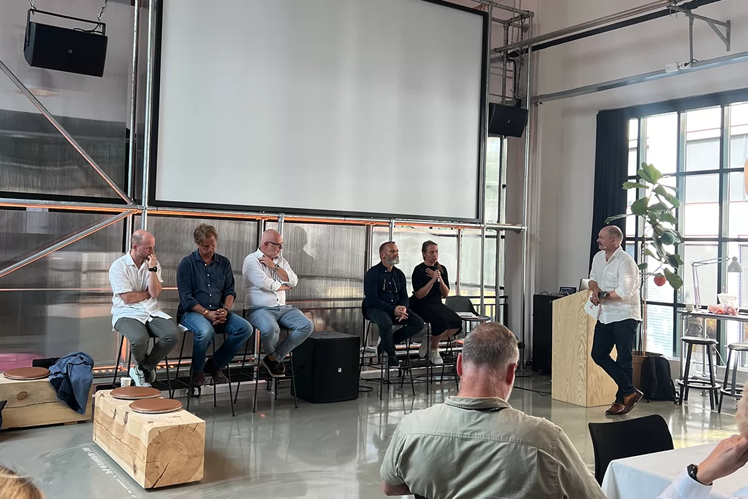 Gunnar Bratheim jobber med by- og områdeutvikling i Multiconsult, og åpnet samtalen med å presentere planene for å omdanne Skøyen til et tettere og mer urbant område. OMAs Rasmus Reinvang ledet deretter en samtale med leder av byutviklingsutvalget Haakon Riekeles (V), arkitekt og utvikler Bjørnar Johnsen (Oslo House), grunneierrepresentant Richard Kristensen Kruse (Storebrand Eiendom), Sjur Mehlum (transformasjon og bygningsvern i Multiconsult) og den sosiale entreprenøren Kjerstin Bjerka (Nabolagsfabrikken).