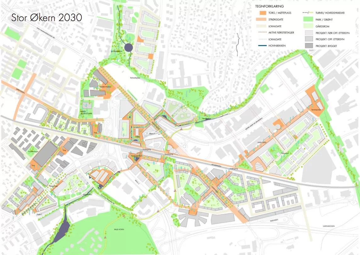 Stor-Økern Områdeforum har utarbeidet et felles visjonskart for Stor-Økern på 10 års- og 30 års sikt. Hensikten var å avdekke om prosjektene med tilhørende byrom hang sammen og om det eksisterte pain points (konflikter) som var mulig å løse ved hjelp av samarbeid.