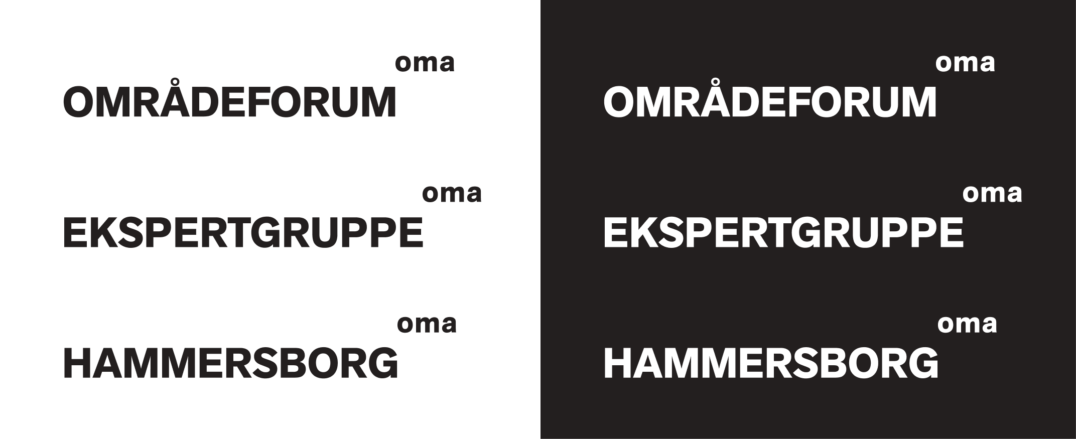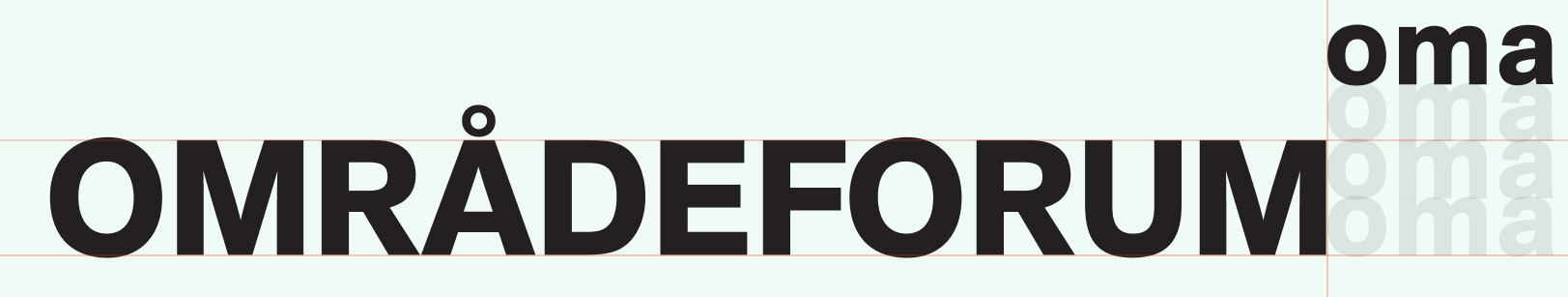 Dersom det er behov for å knytte OMA til konkrete tema kan forkortelse settes sammen med temabetegnelse. Temabetegnelse settes da i Akzidenz Grotesk Next Pro Bold – i store bokstaver – og OMA logo plasseres øverst til høyre som vist nedenfor.
