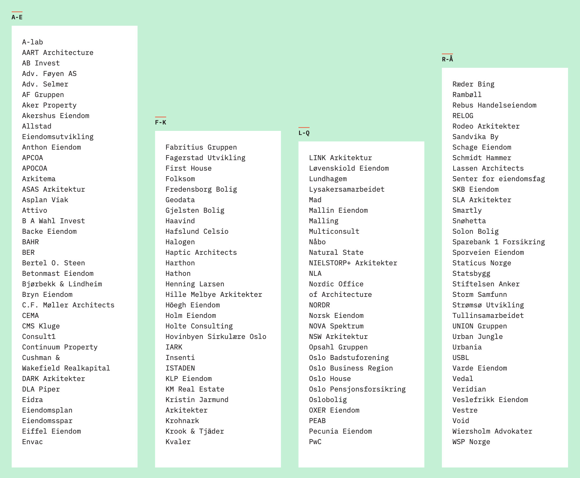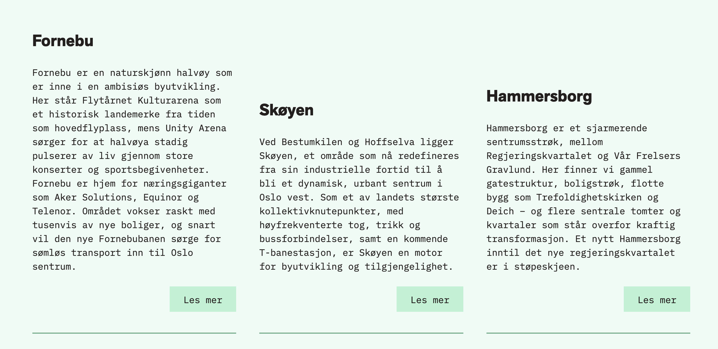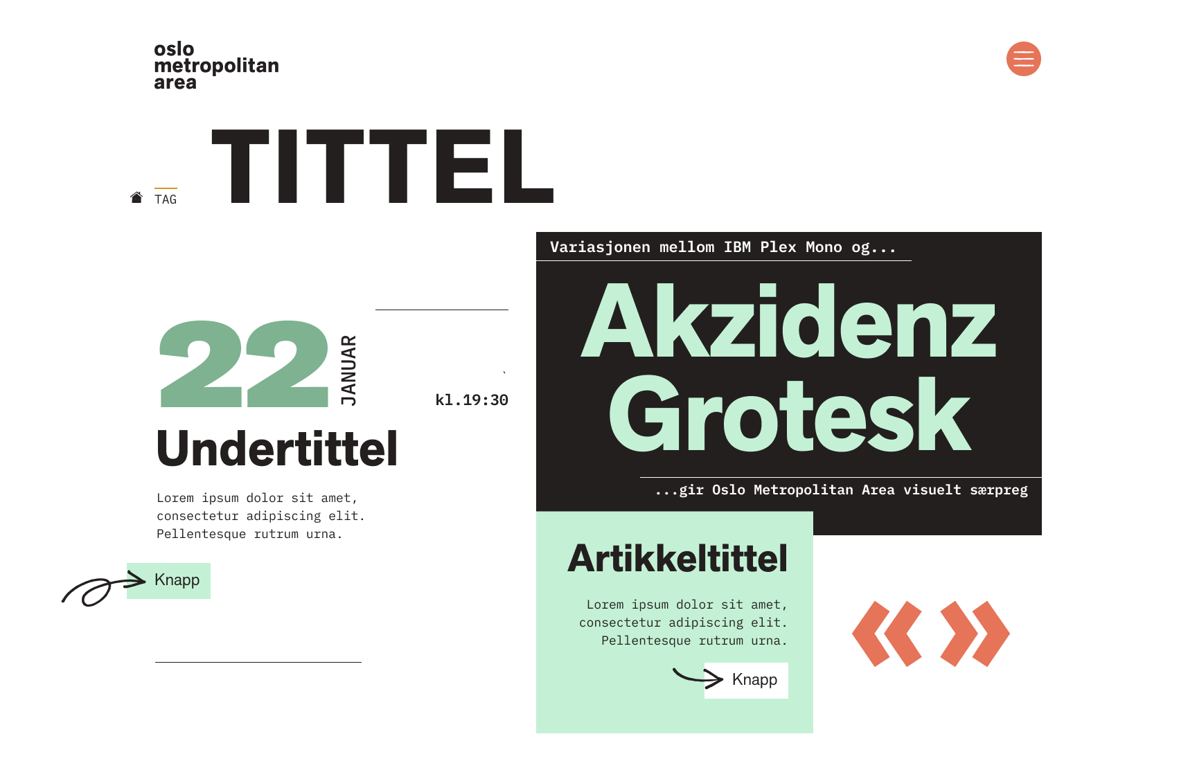 Identiteten består av to skriftsnitt, Akzidenz Groteks Next og IBM Plex Mono. Løpende tekst settes i IBM Plex, hovedoverskrifter i Akzidenz Grotesk Next Bold i store bokstaver, underoverskrifter i Akzidenz Grotesk Next Bold. Fremhevede tekstelementer settes i andre vekter av Akzidenz Grotesk Next.